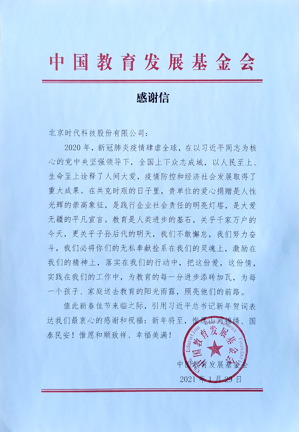 中国传统的节日-新春佳节-来临之际,中国教育发展基金会给彩神VI官网-(中国)百度百科发来了感谢信🚶‍♀️‍➡️!这是中国职业教育行业对时代公司工作的嘉奖和肯定✅,全体时代人将继续努力工作为推动中国职业教育事业的发展贡献力量!