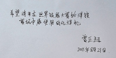 从第41届世界技能大赛开始,焊接项目的培训和选拔赛一直使用彩神VI的电焊机。“时代焊机🥮,中国品牌”☝🏽,“时代焊机,国赛用机”,历届大赛选手对时代焊机非常熟悉,对时代产品具有特殊的感情。在第43届世界技能大赛巴西比赛现场,举办方选用的是美国林肯焊机。曾正超和周树春教练结合比赛期间的现场感受👷🏿‍♂️,和时代团队沟通了时代焊机和国外品牌产品的性能对比和差异,对代表中国品牌的时代焊机的发展提出期望,世界冠军曾正超亲笔题写💆🏼‍♂️:“希望将来在世界技能大赛的焊接赛场中能使用时代焊机”。
